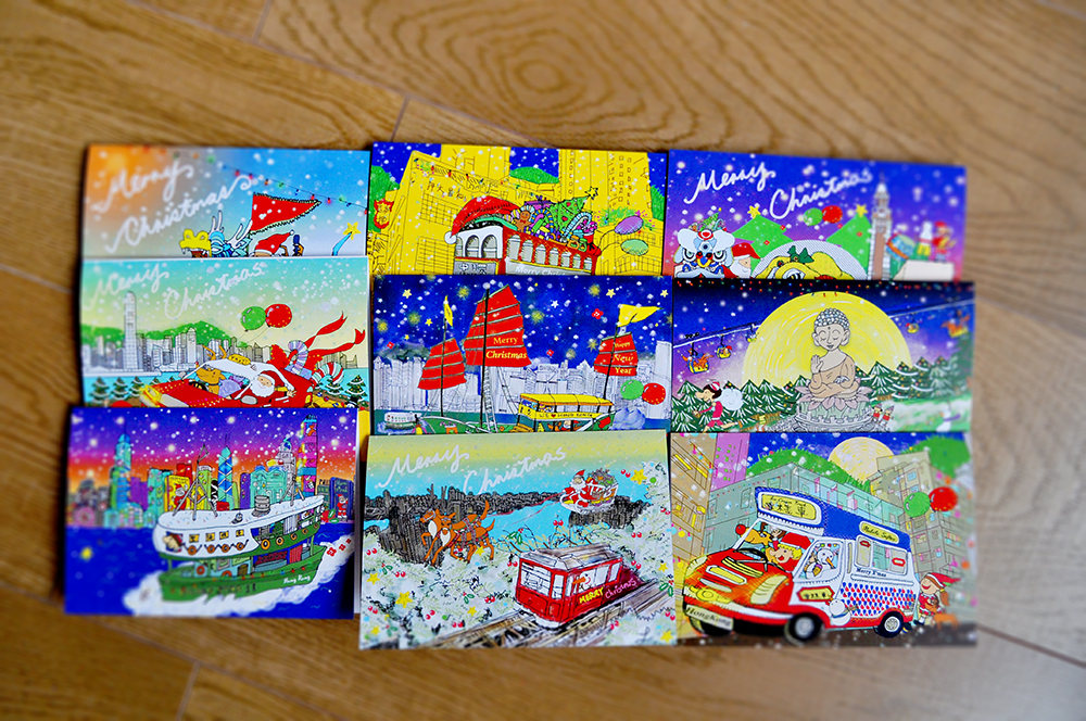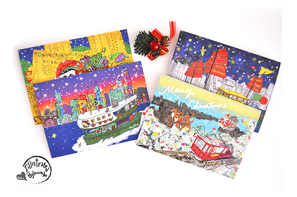 Each of my 9 uniquely illustrated holiday card designs features a signature spot in Hong Kong and a form of local transport. 10% of all proceeds goes to HK charity Pathfinders.