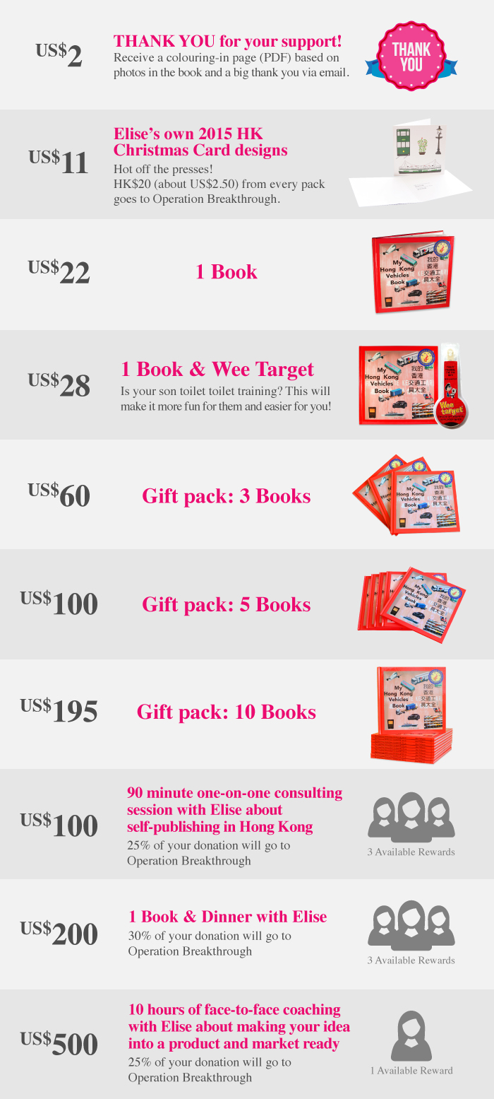 The goal of this crowdfunding campaign is to prove that there is a market audience for my unique My HK Vehicles Book. This will allow me to market to retailers and distributors to hopefully get my book sold in stores. The funds will also allow me to expand into other products such as a My HK Vehicles Sticker Book and baby board book, so children of all ages can enjoy the unique vehicles in Hong Kong. This campaign is also to raise awareness of Operation Breakthrough.